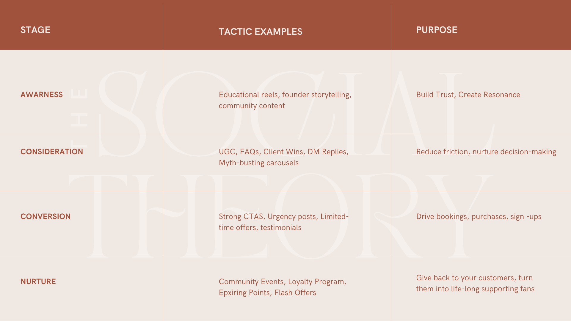 Using your brand pillars, map content and tactics across each stage. Weaving in psychological triggers (like FOMO, social proof, and exclusivity) strategically, without ever being pushy.