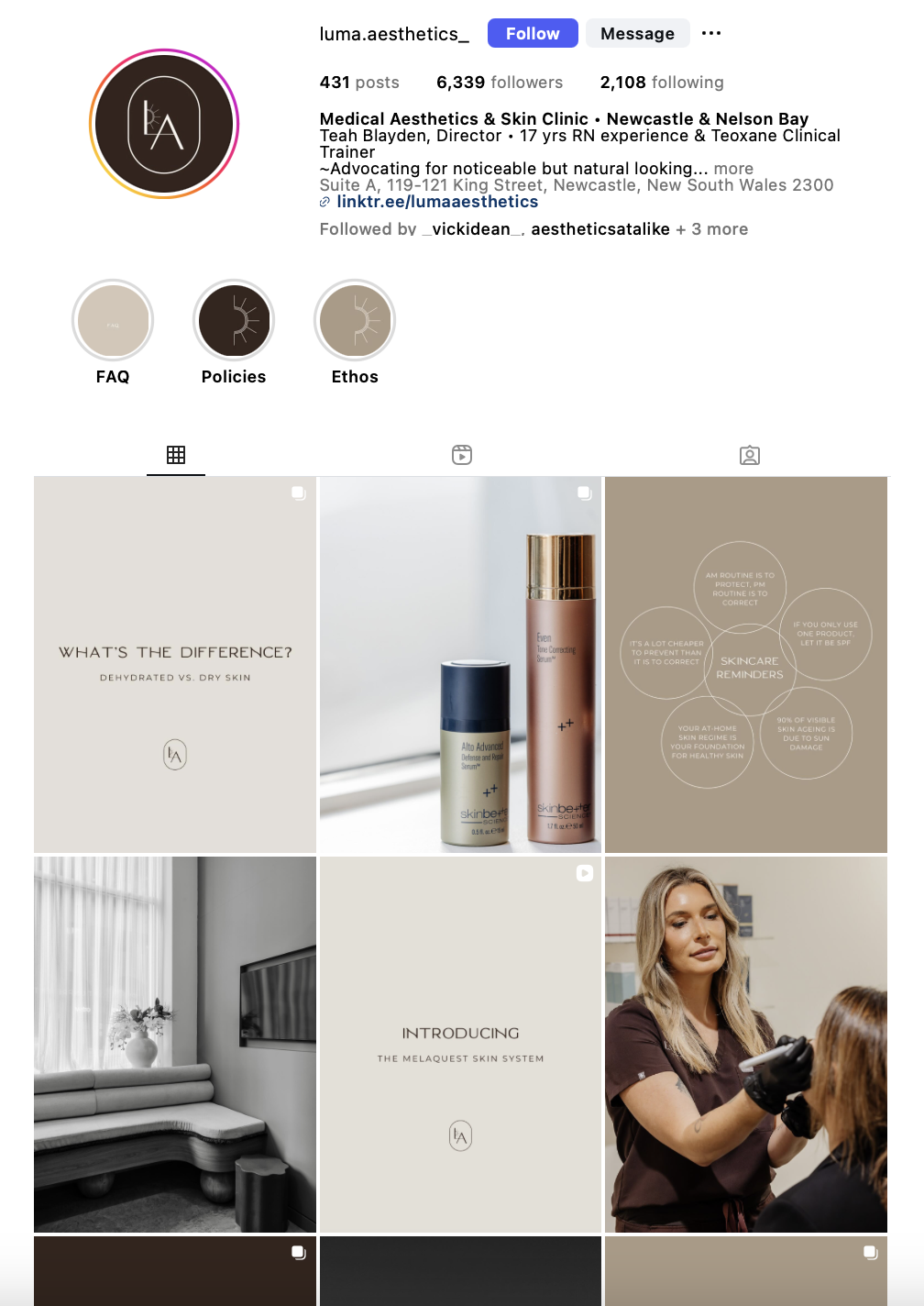 Injectables Queen have layered multiple marketing channels (radio, billboards, Google Ads) and, more strategically, they’ve trained their nurses to grow their own social presence. Each practitioner has a personal Instagram account that links back to the main clinic, turning every team member into a micro-influencer and trusted face of the brand.